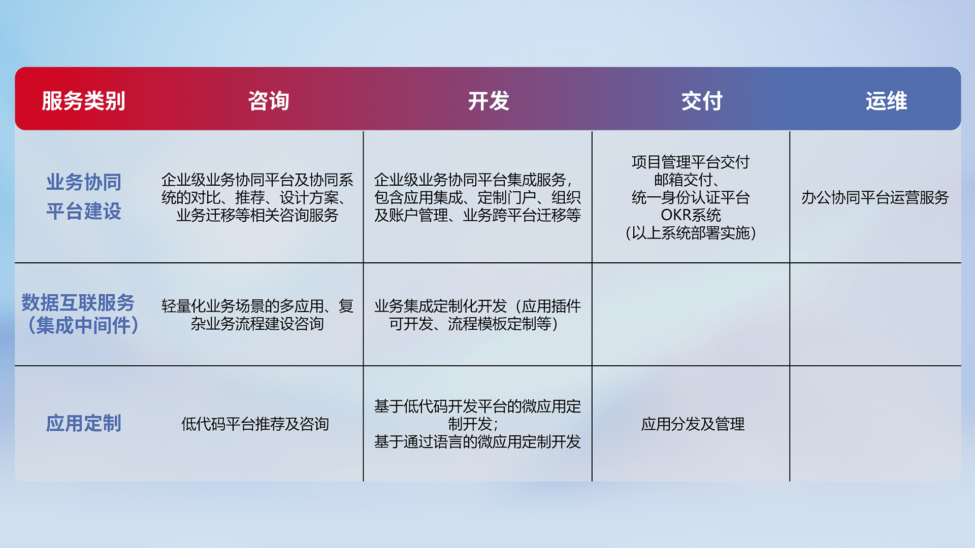 针对钉钉、、、、企微、、、IDaas等平台级产品提供产品的规划、、方案、、、、交付、、、、定制化开发等服务,,,实现如统一协同办公、、智能客户服务、、、、混合会议管理、、、智能数据查询、、、、等业务场景,,,实现数字化转型。。。。