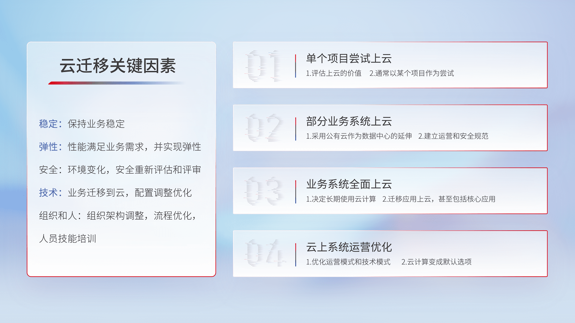 结合实际业务,,,从规划设计、、云平台选型、、、、云原生改造、、、、数据迁移、、集成交付,,迁移全过程为客户识别最佳上云路径,,,做好风险识别管理,,设计网络架构、、、身份权限、、、、安全审计合规、、、、操作审计、、、日志审计、、、监控告警策略、、多站点容灾设计等,,对云上基础设施进行整体规划,,提升IT治理水平,,以满足弹性、、高可用、、、、高性能的需求。。