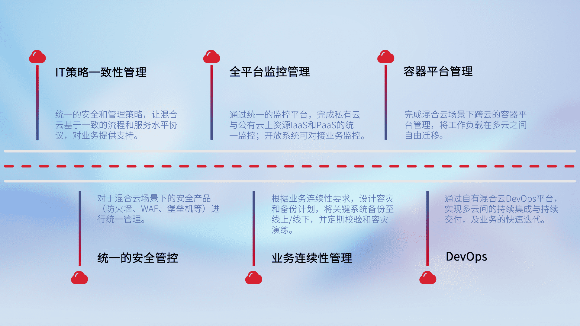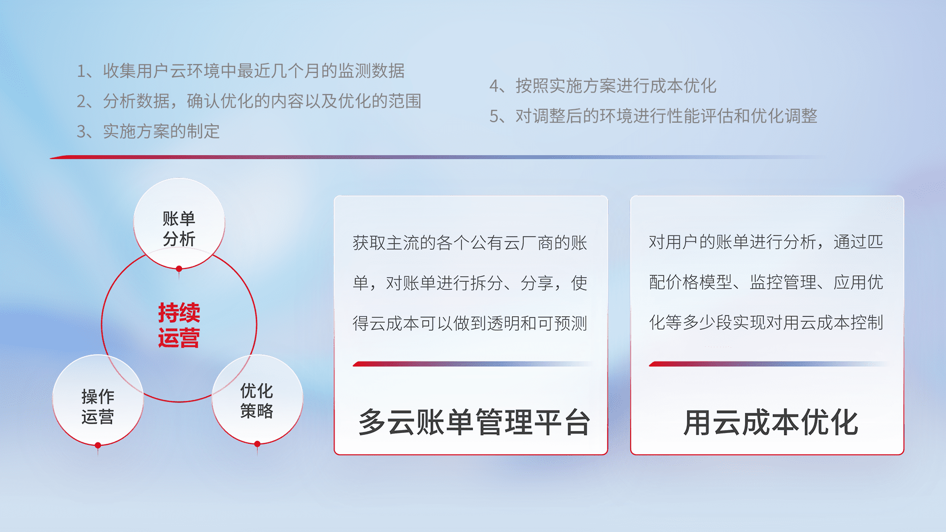 通过多云纳管,,,以统一的资源数据模型把客户的云资源进行抽象和封装,,,,进而实现对多云资源的统一操作,,,保障云资源管理的可靠性、、、稳定性与可用性。。。。量身定制化运维内容,,,,配置、、、开发运维、、、补丁管理、、、、备份、、监控、、认证和访问管理、、、审计和日常巡检等,,,,保障在用云过程中的可靠度,,,稳定度以及高可用率。。。。