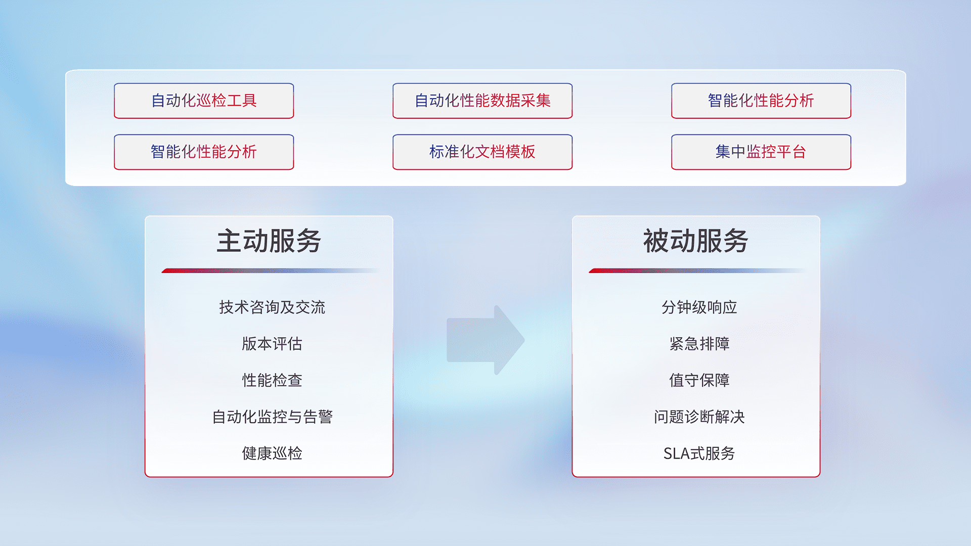 智能化工具和标准化文档,,保障服务质量,,提供主动服务(包含技术咨询、、、、版本评估、、、性能检查、、自动化监控与告警、、健康巡检)和被动服务包含(分钟级响应、、、、紧急排障、、、、值守保障、、、、问题诊断解决、、SLA服务)。。。。